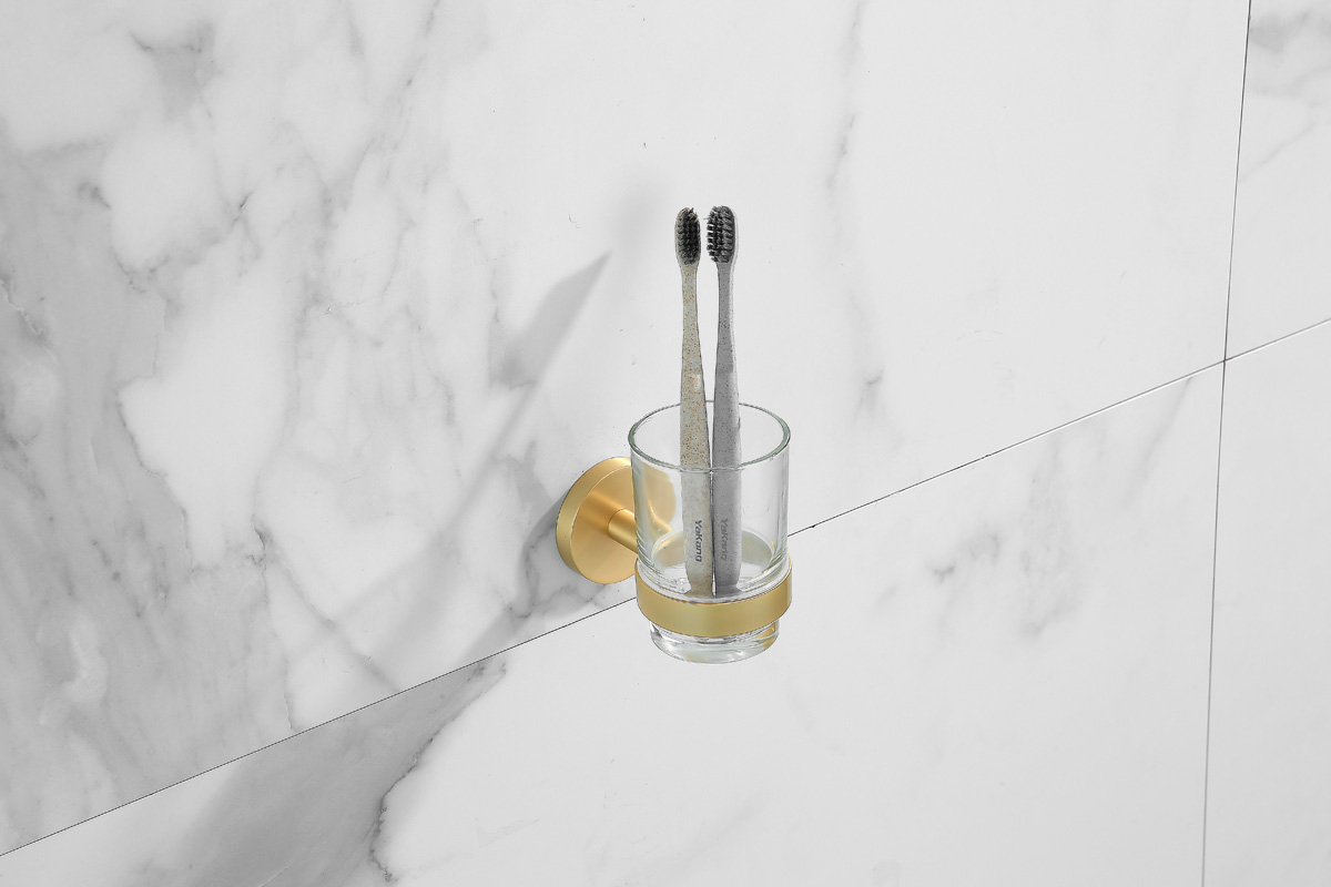 Zijn de tandenborstels op de wastafel ook een doorn in jouw oog? Met de Saniclear glashouder los je dit probleem eenvoudig op. Deze glashouder bevat namelijk een glas waar je netjes de tandenborstels in kunt zetten en je bevestigt ‘m aan de muur. Zo houdt je jouw wastafel schoon én opgeruimd. Ook is het glas uit de houder te halen waardoor er altijd een drinkglas in de buurt is. In de houder zit een kunststof strip waardoor het glas niet in aanraking komt met metaal. Hierdoor blijft het glas niet alleen stevig zitten, maar krijg je er ook geen krasjes op. De glashouder is voorzien van een messing bevestigingsplaatje. Dit plaatje kan gelijmd of geschroefd worden tegen de muur. Ideaal als je bijvoorbeeld niet in de muur mag boren. Onder de toebehoren vind je de lijm. De schroeven krijg je meegeleverd met de houder. Specificaties Merk: Saniclear Serie: Brass Kleur: Geborsteld messing (mat goud) Hoogte: 9.5cm Diepte: 10.5cm Diameter glas: 6.5cm Met bevestigingsmateriaal Saniclear Brass accessoires Wist je dat de Brass serie nog veel meer accessoires in petto heeft? Deze accessoires zijn heel uiteenlopend, van wisser tot toiletborstel. Zo kun je jouw hele badkamer en toilet voorzien van deze perfect, matchende parels in het goud. Alle accessoires zijn gemaakt van messing, waardoor jij nog jarenlang plezier hebt van de items. Ze zullen namelijk niet gaan roesten of oxideren. De volgende accessoires vind je in de Brass serie: Handdoekhouder Glashouder Zeepdispenser Handdoekhaak Toiletrol houder Reserverol houder Toiletborstel Shampoo houder voor aan de muur Shampoo houder voor over je glaswand Raamwisser Vloerwisser Inbouw toiletrolhouder zonder klep Inbouw toiletrolhouder met klep